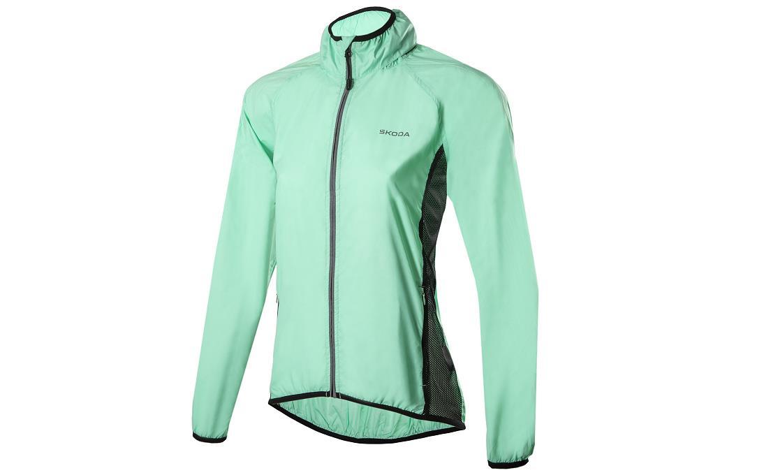 155,00 złDamska wiatroodporna kurtka rowerowa w kolorze jasnej zieleni. Logo ŠKODA w kolorze odblaskowym i inne elementy odblaskowe.